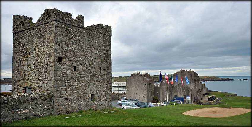 Situated at the entrance to Ardglass golf course is a small two-storey tower dating to the 15th/16th century. In the image above we can see the tower on the left and below it to the right are the remains of Ardglass Castle, which is now the club house for the golf course. The Newerks can be seen at the far end of the club house. The warehouses were a castle type structure with three towers. Lord Charles Fitzgerald demolished most of the building in 1791 and built his mansion, known as Ardglass Castle. A further tower known as Horn Castle lay to the west of the Newerks. This is now the pro shop at the golf club. It has been suggested the Cowd Castle may be a flanking tower of a curtain wall built to protect the warehouses. The entrance to the tower is in the west wall.