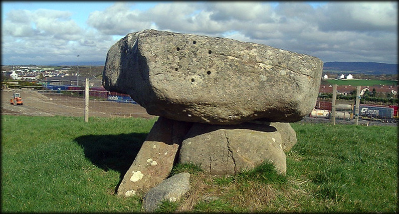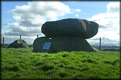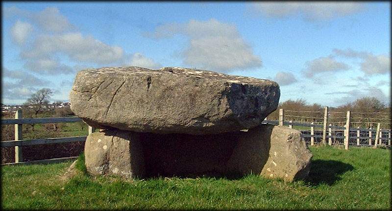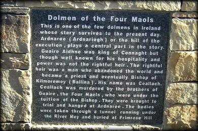 Ballina Dolmen of the Four Maols Known locally as the Dolmen of the Four Maols, this megalithic tomb is not a portal tomb but a kist. It is situated on the edge of the town near the railway line. At some stage one of the side-stones has been removed from the kist and left lying close by. This stone is visible in the picture bottom left. This tomb is the largest of its type that I have seen. Folklore: The plaque on site reads; Ardnaree or hill of the execution as it is known plays a part in this story. Guaire Aidhne was King of Connaght but not the rightful heir, the rightful heir was a man named Ceallach who had abandoned the world to become a priest and eventually Bishop of Kilmoremoy (Ballina). The Brothers of Guaire, the Four Maols, murdered Ceallach whose tuition they were under, they were brought to trial and hanged at Ardnaree then buried on Primrose Hill.
