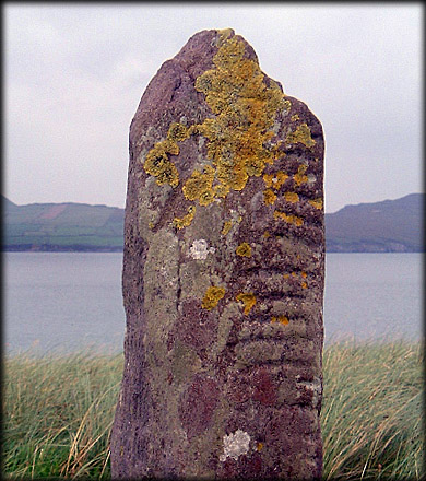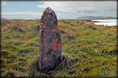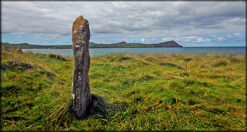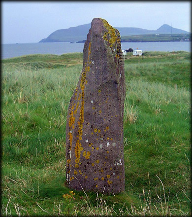 Ballinrannig Ogham Stone Beautifully situated on a grass covered sandy knoll overlooking Smerwick Harbour, this ogham stone is all that remains on site. During a storm at the end of the 18th century seven ogham stones were exposed also a fragment of what may have been an ogham stone and a cross inscribed stone. Six of the stones and the cross slab were removed by Lord Ventry, four of them and the slab are in the collection at Colaiste Ide and the other two are in the grounds of Chute Hall, Tralee. The one remaining stone CISP No Balig-7/1. stands at 1.73 metres high, 0.51 metres wide and 0.18metres thick.