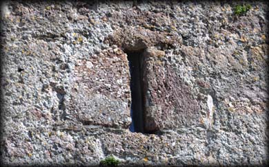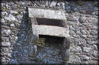 The entrance in the west wall is protected by a machicolation on the fourth floor and a murder hole on the inside. All the visibly dressed stone is of red sandstone. There is a fine base-batter on the northside of the tower. There are three chambers built into the northeast wall. One of these is a small chapel complete with a piscina, aumbry and altar shelf. The tower, which is only open to the public during the months of July and August, is built on the lower part of a steep sided valley. I am looking forward to paying visit during the summer period to see the small display on view inside the castle and get some images of the interior.