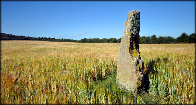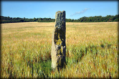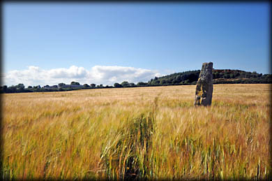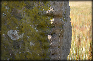 I figured the long spell of dry weather would be an excellent time to visit the ogham stone at Crehanagh South. The stone is situated on farmland about 200 metres in from the road. This two metre high megalith was first erected as a standing stone, aligned N-S. The south side of the stone is badly damaged. Macallister/1945 believes this was probably done to remove an earlier inscription. The newer inscription, on the SW and SE angles, reads: VOCAGNI MAQI CUR[I]T. |