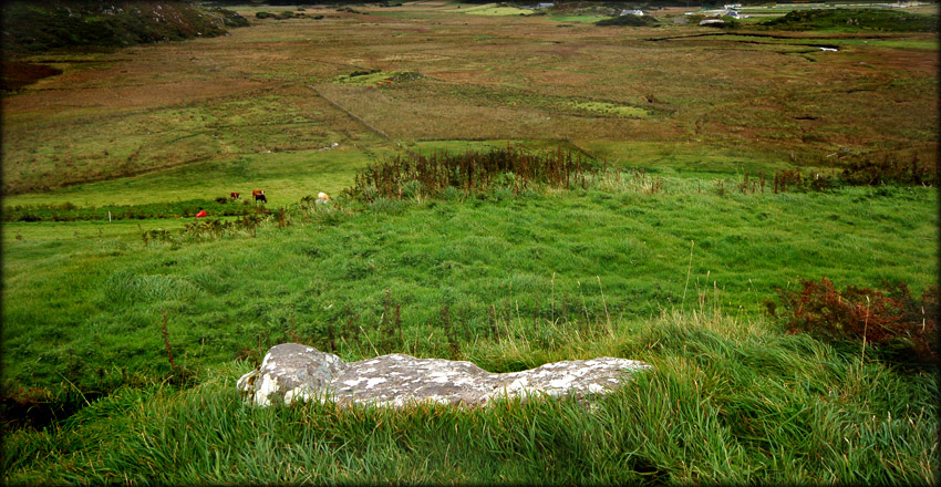 Gleann Cholm Cille/Glencolmcille Station 6, Leac na hAchaini - The Stone of the Entreaty AKA The Flagstone of the Soles of the Feet, this large earthfast slab lies to the south east of the enclosure surrounding the church at station five. There is an equal-armed cross with expanded terminals inscribed within a circle. The terminals extend beyond the circle. Unfortunately we were unable to shoot good images of the decoration on this trip. The pilgrims would stand on the stone facing towards the west and make three wishes. There is no Turas sign at this stone, it has been moved next to St Colmcille's Chair, which is the next place on our journey around the turas at Gleanncholmcille. In his book Michael Herity believes this flagstone was part of the original turas at Glencolmcille.