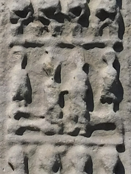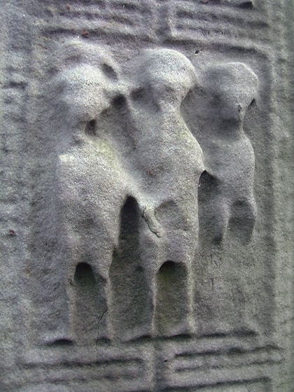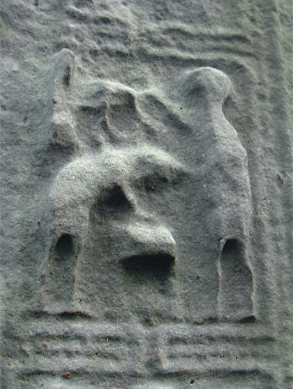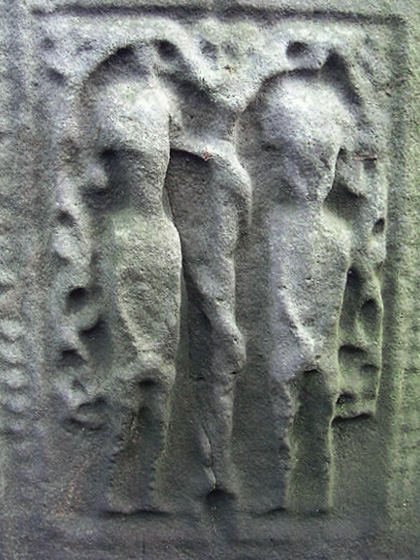 The east face, pictured below right, bears scenes from the bible that are linked to the high cross at Clones in County Monaghan. From the base up the scenes are, East Face: 1. The Annunciation to shepherds.2. Adoration of the Magi.3. Baptism of Christ. 4. Marriage feast of Cana. 5. Loaves and Fishes. 6. Arrest of Christ or Ecce Homo. |