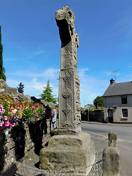 Donaghmore, Tyrone A monastery was founded here by St Patrick for St Columb in the sixth century. Situated at a road junction at the west end of the village stands this large sandstone cross, it is believed to be either two separate fragments joined together or two fragments of the same cross with part of the shaft missing. The cross stands 4.8 metres high and is badly weathered. The north and south sides feature some ornament. Head. Bears a Crucifixion scene, on the arms on either side of the crucifixion are three figures, the central figure on each of the arms may represent the two thieves being held by soldiers.