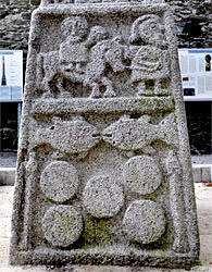 The theme of the cross is the help of God, how God came to assist people during their hour of need. An another unusual feature of this cross is t all the biblical scenes appear on the base of the cross. Daniel in the lions pit, the three children in the fiery furnace, the fall of man and the miracle of the loaves and fishes are amongst the scenes depicted. All four sides of the shaft are decorated with animal or bird carvings. It would have been interesting to see how the naive figure carvings, shown below, appeared after being painted. At the centre of the head on the west face is an ancient spiral sun swastika, and anther pre-Christian sun symbol, the lozenge can been seen below it. A resurrected Christ is depicted at the centre of the head on the east face.