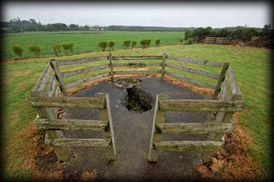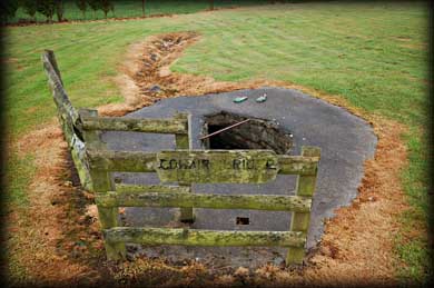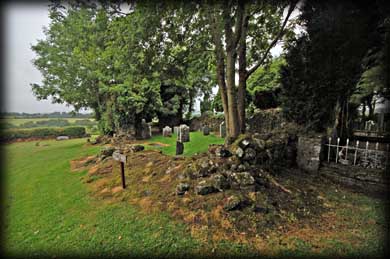 They may not be the prettiest of wells but are certainly worth a visit. The old Parish Church is situated in a small oval enclosure that also contains the graveyard. Very little remains of the nave and chancel church, most of the walls being reduced to the foundations and what remains of the pointed chancel arch is covered with vegetation. There is a window light in the south wall of the nave. In the north chancel wall is a tomb recess. The site is worth visiting for the ambiance rather than the building itself. The three wells, the graveyard and church, plus the wonderful sunken trackway all add up to a peaceful hour well spent. |
