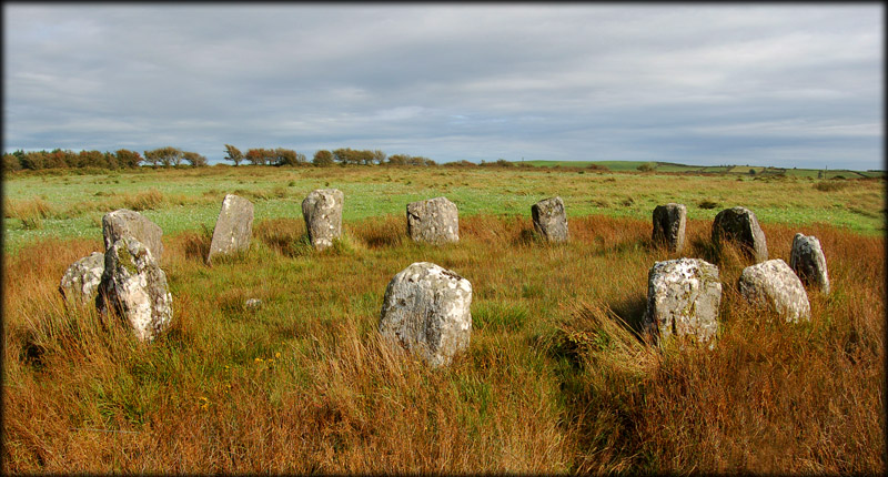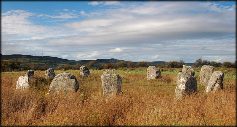 Reanascreena Stone Circle The recumbent stone circle at Reanascreena, 'The ring of the shrine' is situated on the summit of a large hill about a kilometre SSW of the village. There is a low bank with a ditch surrounding the circle, but this is almost hidden from view, as the circle, as shown in the image above, stands in a tall reedy type of grass. I don't think the grass takes anything away from the circle but actually adds to the wonderful serene atmosphere here.