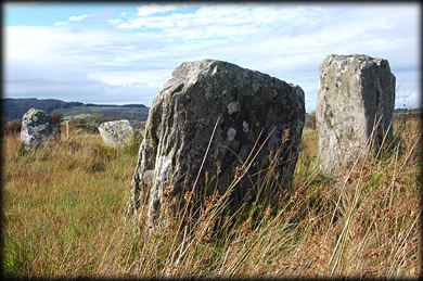 The circle consists of twelve stones with two flat topped portal stones about 1.5 metres high and a recumbent stone around 1/2 metre high, the portal stones are shown below with the recumbent and it's two flankers. The circle has a diameter of just over 9 metres similar to other circles in the region. At the centre of the circle is a small piece of quartz, also visible in the image below. It is a long uphill walk to the circle but your efforts are well rewarded. I will definitely visit again the next time I am in this locality.