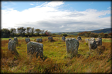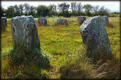 Situated: From Ross Carbery take the N71 west for 4 kilometres, after Connonagh bridge take a right turn, then take the first right, go 2 kilometres until there are two farmhouses on your left, between them is a long field. Walk to the top of this field into the next field. The circle stands in the northwest corner. The is an electrified fence so please ask at the house to the right. Discovery Map 89: W 2636 4111. Last visit Sept 2006. Longitude: 9° 3' 48" W Latitude: 51° 37' 4" N Photos: Jim Dempsey. |