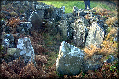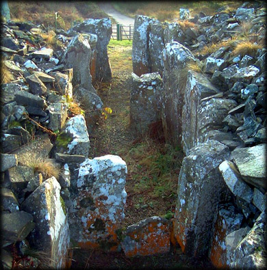 Situated: From Crossmaglen take the B135 north for 1 kilometre and turn right at the crossroads. Drive along this road to a T-Junction; take a left here. After about 300 metres you will see the forestry, on your right. A sign points to the cairn. Drive down and park at the gate, the court cairn is a further 200 metres along the path. Discovery Map 28: H 9044 1785. Last visit Sept 2005. Longitude: 6° 37' 2" W Latitude: 54° 6' 6" N Photos: Jim Dempsey |