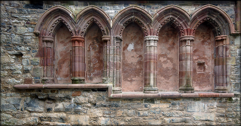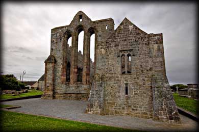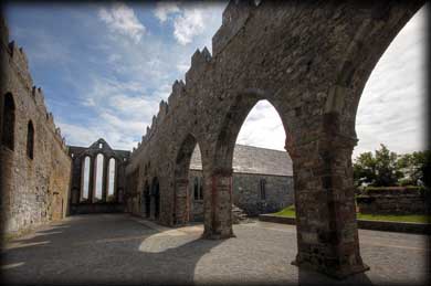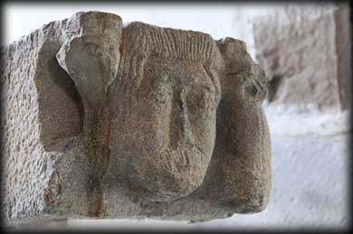 Ardfert 12th/13th Century Cathedral The Cathedral at Ardfert is built on the site where St Brendan founded a 6th century monastery. Most of the cathedral dates to the 13th century, but part of the North wall actually dates back to the 12th century. The east wall, pictured right, has three lancet windows and there are an amazing nine lancet windows in the south wall. Below these windows there is a fine sedilia, pictured below. The western wall has a beautiful Romanesque doorway, with outward pointing chevron decoration and is flanked on either side with a blind arcade. Unfortunately on our visit the doorway was sealed off due to some restoration work. The battlements were added to the cathedral in the 15th century. The south transept has been restored and is now being used as the main entrance. Some of the original carving work has been moved into the transept for protection, where there are a number of interesting items on display. These items include two wonderfully carved effigial slabs bearing ecclesiastical figures, that once stood in the arcades either side of the east window. Also present in the exhibition are some head carvings including a gargoyle. Some other gargoyles are still in situ. Close to the main entrance of the transept stands a 1.22m high ogham stone. A little bit of the inscription still survives " CT (A) N QLOG ". |