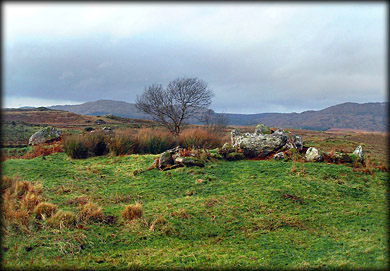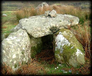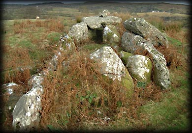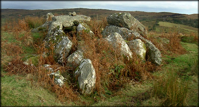 Situated: From Killybegs take the R 263 north for Donegal town after 2 kilometres take a left for Ardara the N 56, then take the next left , then right at the T junction just after the third left is a row of houses one of which is set back from the road, left of this house is a track that runs 200 metres up to the tomb. Discovery Map 10: 7267 8027. Last visit Nov 2002. Longitude: 8° 25' 25" W Latitude: 54° 40' 11" N Photos: Jim Dempsey. |