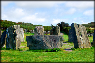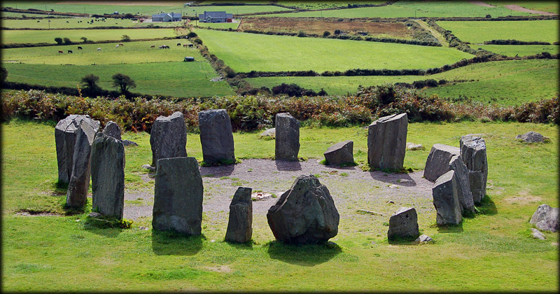 Drombeg Stone Circle AKA The Druid's Altar Drombeg is probably Irelands most famous stone circle, it is an axial stone circle with the recumbent or axial stone lying to the south-west. The circle consists of seventeen pillar stones that are graded from the two large portal stones, each 2 metres high, at the north-east towards the axial stone. The pillar stones are local sandstone and the axial has two cup marks, and what looks like an axe -carving, on it's upper surface.
