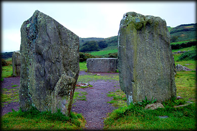 Axial stones are found at thirty of the stone circles in the Cork and Kerry area. At the winter solstice the sun sets at a point on the horizon aligned with the axial stone and the portal stones. |