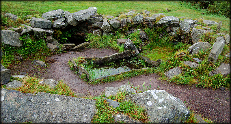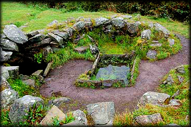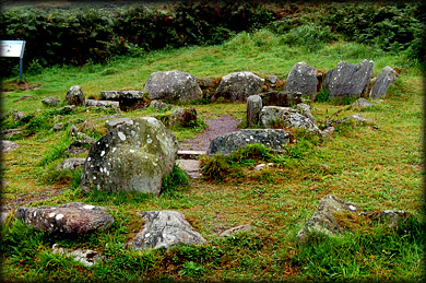 Also present at the site is a Fulacht fiadh a communal cooking pit with a hearth. Hot stones were taken from the fire and dropped into the water trough, recent tests have shown they could boil seventy gallons of water in about fifteen minutes. Pictured below are two circular stone huts conjoined by a doorway. The cooking area is just to the right of these huts. A stone path runs from the huts to the fulacht fiadh. |