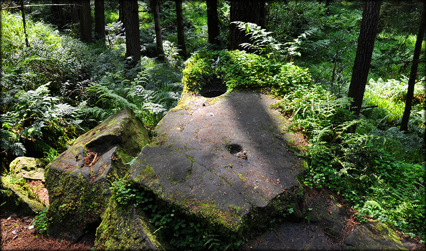 Situated: Driving along the R186 from Monaghan to Clogher take the first right immediately across the border. Go through a crossroads and then take the right split in the road. Stop at the Altadaven car-park. Walk along the trail into the woods and then take a smaller trail on your right, walk along the trail to the boulders. Discov Map 18, 28A: H 5970 4955. Last visit Aug 2019. Longitude: 7° 4' 51" W Latitude: 54° 23' 27" N Photos: Jim Dempsey. |