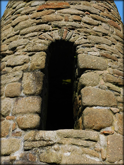 There is a large breach in the west side of the tower, but on the east side you can still see the partial remains of the conical cap at the top of the drum. A window, facing east, is also visible just below the cornice, and part of another window faces north, suggesting there may have been four windows at the top of the drum, facing the four cardinal points. There is another window in the drum located above the arched doorway, which is positioned 2.64 metres above ground level and faces ESE, see image below left. Many of the putlog holes, used to construct the tower, are still visible in the drum. |